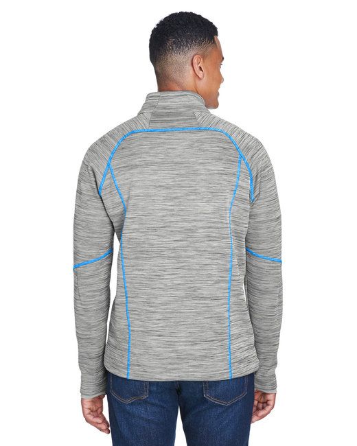 bonded with 100% polyester microfleece; 7.4 oz./yd2/; 100% polyester mélange jersey; inside storm placket with chin guard; contrast center front reverse coil zipper ; stretch storm cuffs with thumb holes; chest pocket with contrast invisible zipper; lower pockets with contrast reverse coil zippers; contrast coverstitch details; audio port access through inside left pocket; adjustable shockcord at hem;