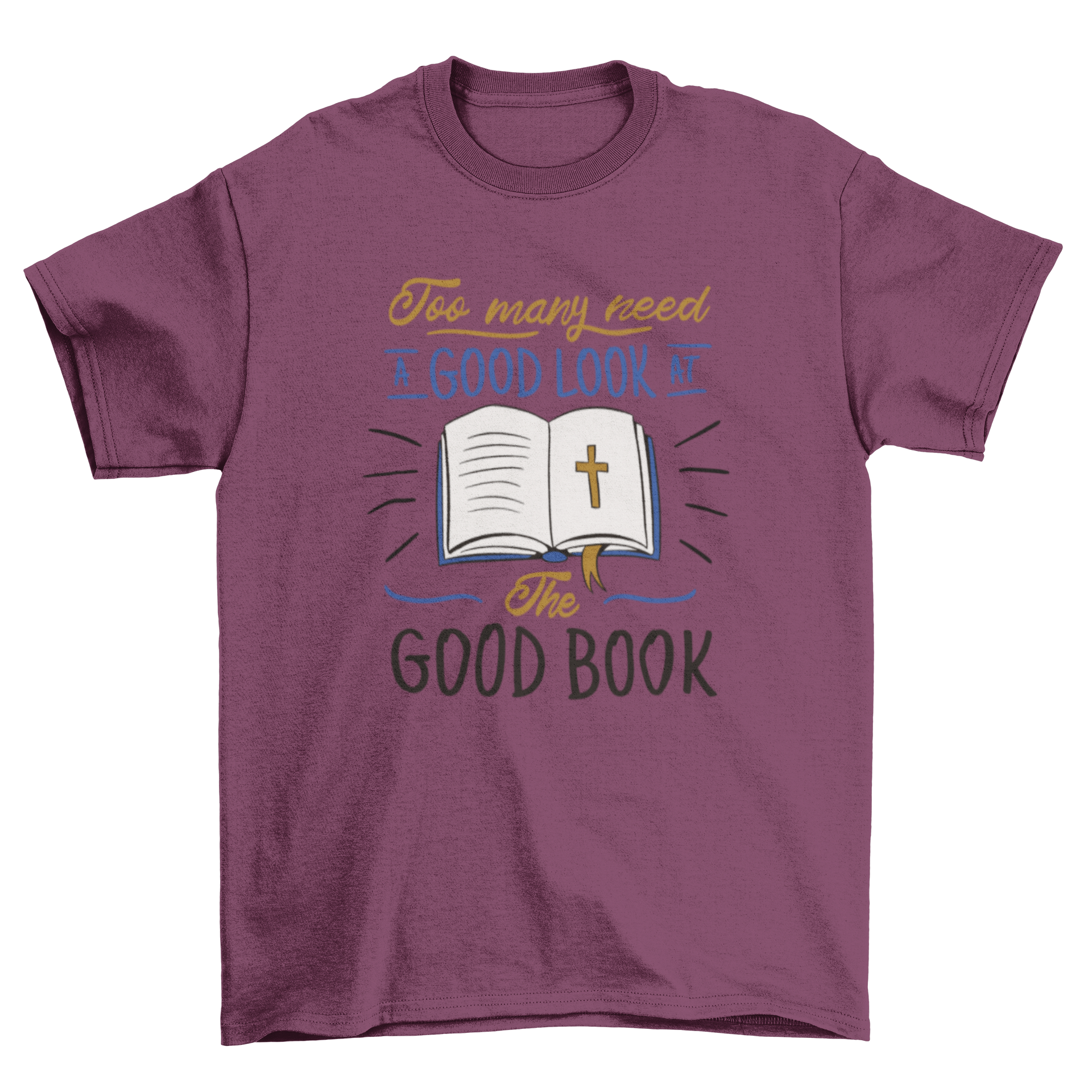 Great t-shirt design featuring a bible and the quote "Too many need a good look at the good book".