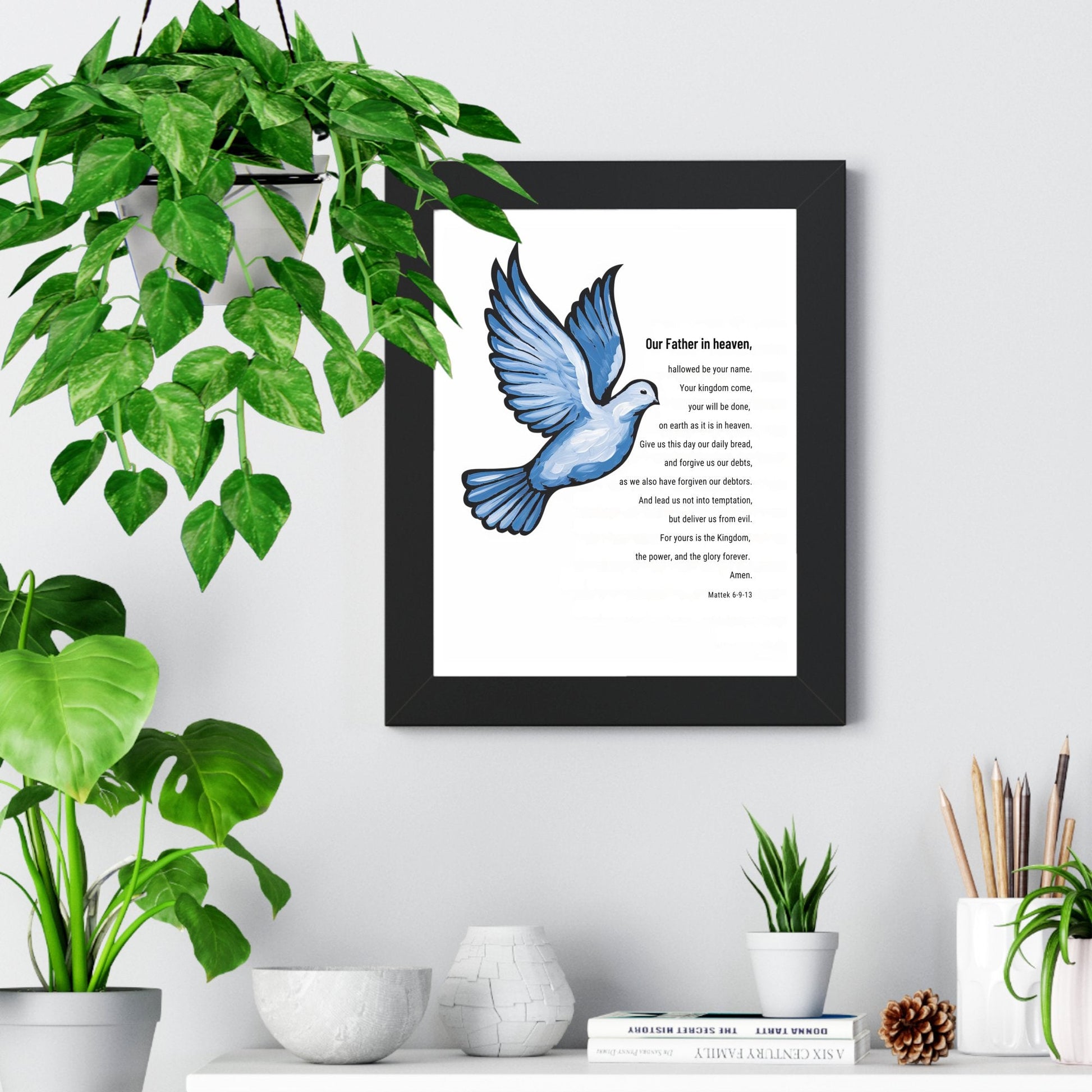 Wall Art Decor, Giclee Poster Art - Our Father Who Art in Heaven Bible Verse Dove Illustration Artistic Spiritual Inspirational Artwork. Indulge in the epitome of versatile elegance with this modern wall art print. This modern wall decor is meticulously designed to seamlessly enhance any space, be it art for the living room, bedroom art, or wall decor for the office. This captivating wall art print transcends traditional boundaries, serving as a perfect blend of wall decor and artwork that is a visual display of modern sophistication for interior design. Elevate the ambiance of your living room with this thoughtfully crafted artwork design, the sleek and contemporary aesthetic makes it equally suitable for artwork for bedroom, foyer, kitchen, or dining room. In the office, let it serve as a beacon of inspiration and motivation, effortlessly complementing diverse decor styles. This wall print is a testament to the harmonious fusion of decorative style and functionality, making it an ideal choice for those seeking a unique and transformative art addition to their living or working environment.
